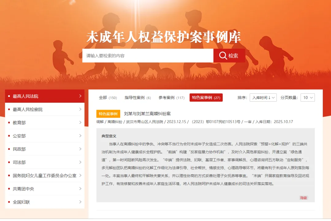 2025年10月17日,由青山区法院红钢城法庭陈倩倩法官承办,法官刁盈超、法官助理舒奕撰写的《刘某与刘某兰离婚纠纷案》入选最高人民法院未成年人权益保护案事例库。该案系湖北省首个涉家事案件未成年人权益保护入库案事例,为我院未成年人权益司法保护工作再添硕果!