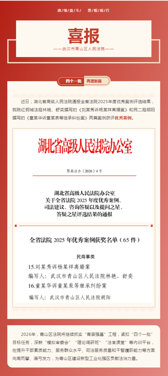 向人民报告丨刘雪飞代理院长在武汉市青山区第十六届人民代表大会第五次会议上作工作报告 向人民报告 | 一图速览青山区人民法院2025年度工作报告 追光2026丨青山区法院两案例获评全省法院2025年度优秀案例 追光2026丨青山区法院获评全省法院第三十五届学术讨论会组织工作先进单位 新闻聚焦 追光2026丨青山区法院两案例获评全省法院2025年度优秀案例 [详细内容] 2026-02-12 追光2026丨青山区法院获评全省法院第三十五届学术讨论会组织工作先进单位 2026-02-06 追光2026丨青山区法院“构建中小微企业快速重整与出清机制”重点领域改革事项获全省通报表扬 2026-02-05 法护营商丨青山区法院楠姆科创带法官工作室揭牌成立 2026-01-30 亲清联动 共话营商丨青山区法院召开“优化法治化营商环境 助力中小微企业健康发展”座谈会 2026-01-28 青山区法院携手武汉大学法学院举办“珞珈刑事法讲坛” 2026-01-23 以案为鉴 警钟长鸣丨青山区法院组织开展职务犯罪庭审旁听警示教育活动 司法公开 审判流程公开 庭审直播公开 裁判文书公开 执行信息公开 司法送达网 律师服务平台 诉讼服务网 法院调解平台 法院动态 通知公告 宪法宣传周丨法治护航 阳光成长 追光2025丨我院红钢城法庭一案例入选最高法院... 追光2025丨第四届长江大保护司法论坛评选结果... 青山区法院召开党组(扩大)会议传达学习党的... 数据会商析短板 凝心聚力再出发——青山区法... 干部素质提升年 青法执行在行动—— 青山区... 全省法院综合性涉企收费目录清单 2024年度武汉市青山区人民法院单位决算公开 如我在诉|一键收藏!67类要素式起诉状、答辩... 武汉市青山区人民法院2025年单位预算 公示 2023年度武汉市青山区人民法院单位决算公开 执行动态 调研成果 荆楚雷霆2025武汉行动丨 温情执行护成长:以... 荆楚雷霆2025武汉行动丨夏日烈焰铸利剑 集中... 荆楚雷霆2025武汉行动丨巧破“离婚转移财产”... 荆楚雷霆2025武汉行动丨邻居的鸽子送走后,我... 荆楚雷霆2025武汉行动丨善用强制措施化解邻里... 荆楚雷霆2025武汉行动丨重比千金 破产审判推进法院参与社会治理的思考与探索 个人破产视野下个人“执转破”的实效考察和制... 打造破产审判“青山样本” 为青山地区优化法... 配偶长期下落不明怎么办? 母亲和弟弟故意侵吞遗产, 如何维护姐姐的权... 遗产继承添新人侄甥代位获财产 诉讼服务 诉讼指南 武汉市青山区人民法院诉讼材料清单指引 (行政案件) 武汉市青山区人民法院诉讼材料清单指引 (一般民商事案件) 武汉市青山区人民法院诉讼材料清单指引 (申请强制执行、恢复执行案件) 申请执行诉讼须知 民商事案件受理的条件 行政案件诉讼须知 以案说法 以案说法丨男子站车尾被碰倒地 诉请赔偿反被罚 以案说法丨醉酒者被送回小区后意外身亡 同饮者需要担责吗? 巧用新规 “审执”发力 高效调处合同纠纷 法院+工会” 诉调对接 携手劳动争议巧化解 一线调研察民情 解忧纾困暖民心 国际禁毒日丨青山法院依法亮剑斩“毒瘤” 互动交流 院长信箱 举报中心 荣誉展示